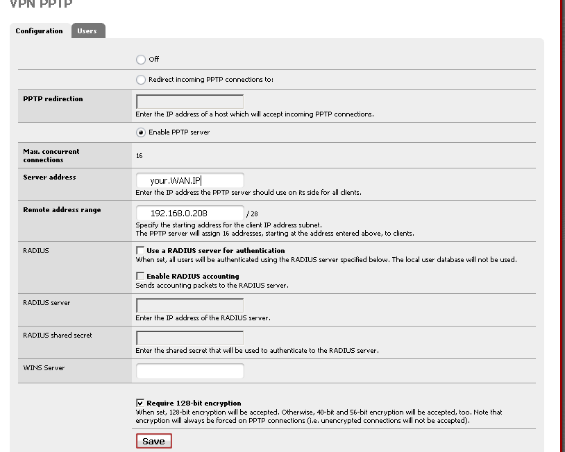 Next, click on the Enable PPTP server radio button. For the Server address put in your WAN (public) IP. For the Remote address range, put in a local IP of which the range will start at. Near the end of the page, check Require 128-bit encryption.