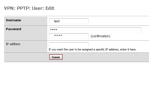 Click save and click on the Users tab. Add a user, in this example, test and a password. You can enter an IP of which the user will be assigned but it's not neccesary.